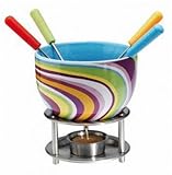 Celebrate a birthday or anniversary around a pot of bubbling cheese or chocolate fondue. This six-piece cheese fondue set from Orka provides all the essentials for a fun meal, with a ceramic fondue pot, steel warming stand, tealight holder, and four fondue forks with pointy prongs. Perfect for a small family to dip marshmallows, banana slices, strawberry chunks, and pineapple squares in milk or dark chocolate. Try bread squares, apples, salami, carrots, or cauliflower dipped in rich, melted cheese. Available in an array of fun designs, Orka's fondue set measures 5-1/2 inches by 6-7/10 inches by 5-1/2 inches. It should be washed by hand. Treat your bookclub, shower guests, or any party to a fun and yummy snack-chocolate fondue. Orka has taken a this retro dessert and served it up with modern style. Keep your melted chocolate warm without burning. Chocolate fondue sets include 1 ceramic fondue pot, 1 steel warming stand and 4 fondue forks. Add a warm hug of chocolate to cake, fruit, or your favorite cracker-you won't believe the endless possibities. Available in an array of fashon designs, you'll find the right one to fit your personality and home decor